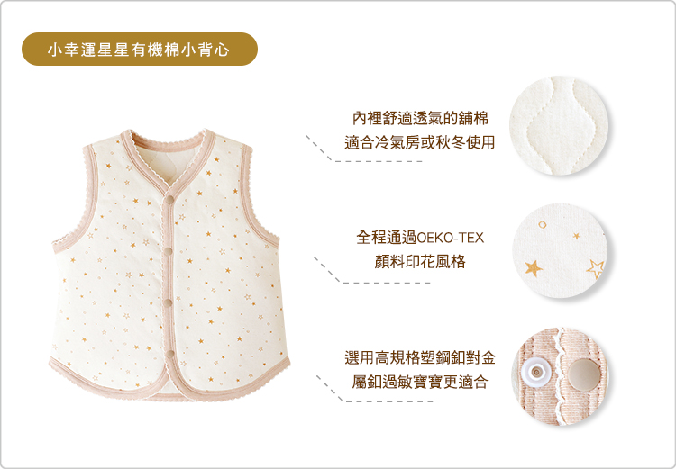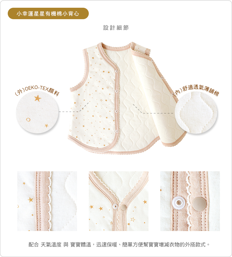 | 商品說明: .採用全程通過Oeko-Tex顏料印花風格。 .內裡舒適透氣的舖棉,適合冷氣房或秋冬使用。 .選用高規格日本塑鋼釦,對金屬釦過敏的寶寶更加適合。 .保暖透氣的舖棉背心,可因應天氣冷熱變化適時穿脫。 .小肚肚不易受涼,溫潤保暖更加倍,帶給寶寶暖呼呼的溫柔呵護! .配合 天氣溫度 與 寶寶體溫,迅速保暖、簡單方便幫寶寶增減衣物的外搭款式。 .因為剛出生的寶寶們,排汗功能尚未發育完全,SISSO建議媽媽們皆可掌握住「層層疊疊」的寶寶穿衣原則,也就是 「 洋蔥式穿搭法 」 來幫寶寶增減衣物。 例如:天氣突然變寒冷時,可以幫原本穿著兔裝的寶寶,直接加上小背心;因室內、室外溫差變化大,寶寶覺得炎熱時,再幫寶寶脫去身上的小背心即可。 可因應天氣冷熱變化適時穿脫,方便又實用,帶給寶寶暖呼呼的溫柔呵護! |