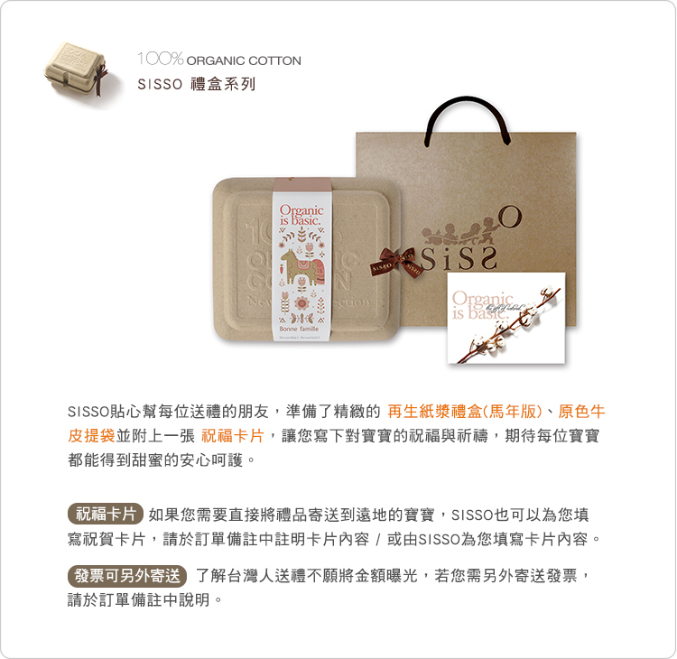 ◆任意搭配您需要的有機棉商品,再選購此組禮盒,SISSO即為您包裝於精緻禮盒中。